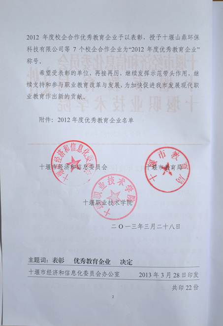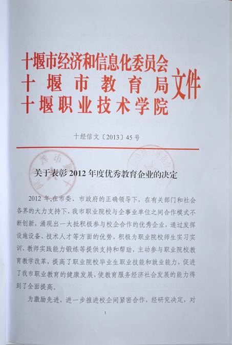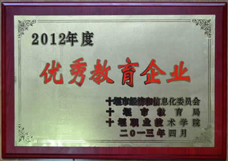 2013年4月3日,我司荣获了由“十堰市经济和信息化委员会”、“十堰市教育局”、“十堰职业技术学院”联合颁发的“2012年度优秀教育企业”的奖牌。至此,公司已连续3年获此殊荣,今年更是以首名的成绩获得“优秀教育企业”的称号。