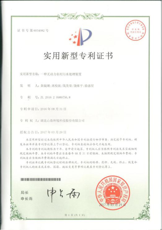 祝贺公司荣获由国家知识产权局授权的“一种无动力农村污水处理装置”实用新型专利证书,专利号为:ZL 2016 2 0989756.8 ;“一种难降解有机物吸附分离系统”实用新型专利证书,专利号为:ZL 2016 2 1002444.x 。
